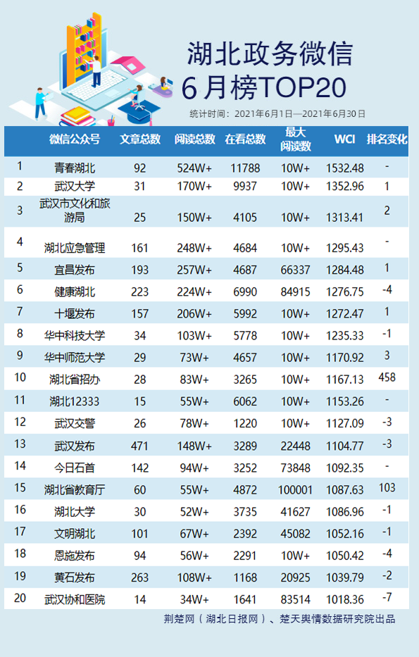 盛夏六月,高招、文旅等話題成為關(guān)注熱點(diǎn)。7月20日,荊楚網(wǎng)(湖北日報(bào)網(wǎng))、楚天輿情數(shù)據(jù)研究院制作發(fā)布了6月湖北政務(wù)微信榜。