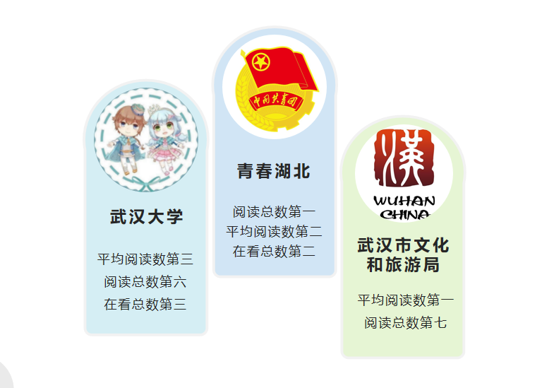 在看總數(shù)本期前五名賬號有細(xì)微差別,“湖北12333”代替“武漢市文化和旅游局”成為第五,“青春湖北”、“武漢大學(xué)”、“健康湖北”分別位居第二第三第四,“平安黃岡”仍居第一。點(diǎn)贊總數(shù)12萬+次的“平安黃岡”獲得點(diǎn)贊總數(shù)冠軍,“青春湖北”“武漢大學(xué)”“華中科技大學(xué)”“武漢市文化和旅游局”緊隨其后。“青春湖北”閱讀數(shù)超過10萬的文章共有15篇,“武漢大學(xué)”和“武漢交警”各4篇、“湖北省招辦”3篇、“武漢市文化和旅游局”2篇。