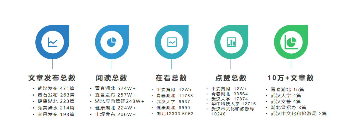 從文章閱讀總數(shù)來看,本期前五名單項(xiàng)指數(shù)有四項(xiàng)高于上期,進(jìn)榜賬號名單有一項(xiàng)變動,十堰發(fā)布成功擠進(jìn)前五。其中“青春湖北”閱讀總數(shù)524萬+次(上期502萬+)、“宜昌發(fā)布”閱讀總數(shù)257萬+次(上期222萬+)、“湖北應(yīng)急管理”閱讀總數(shù)248萬+次(上期238萬+)、“健康湖北”閱讀總數(shù)224萬+次(上期312萬+)、 “十堰發(fā)布”閱讀總數(shù)206萬+次(上期145萬+),位列前五。