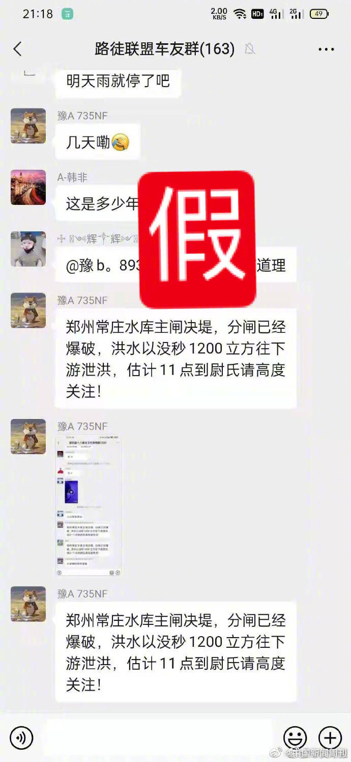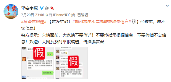 河南省公安廳官方微博@平安中原 :經核實,“鄭州常莊水庫爆破決堤”是謠言