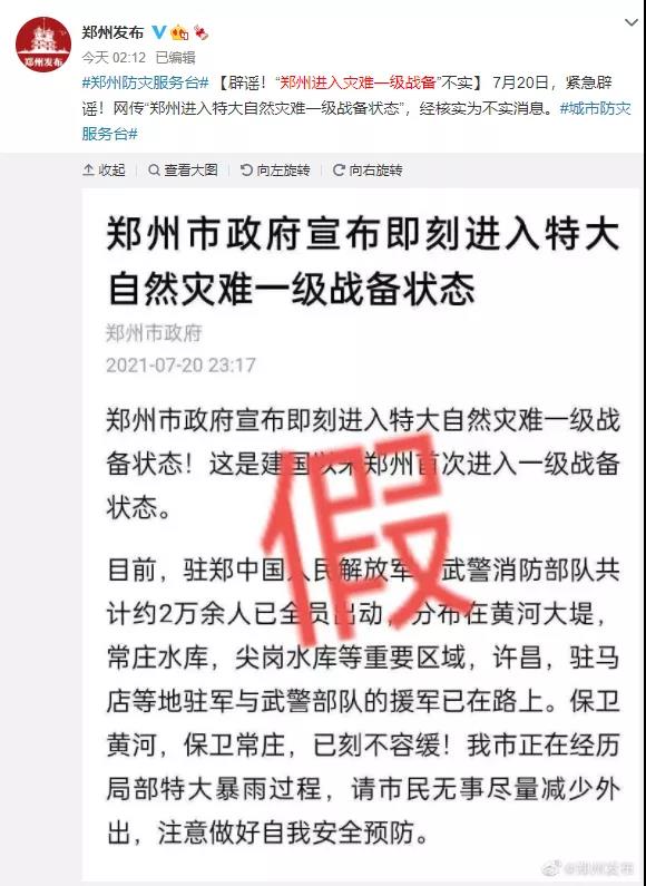 據鄭州市委宣傳部微博消息,7月20日,網傳“鄭州進入特大自然災難一級戰備狀態”,經核實為不實消息。