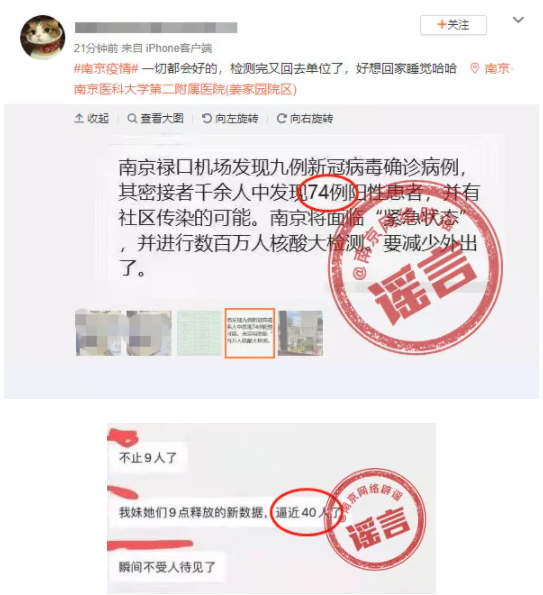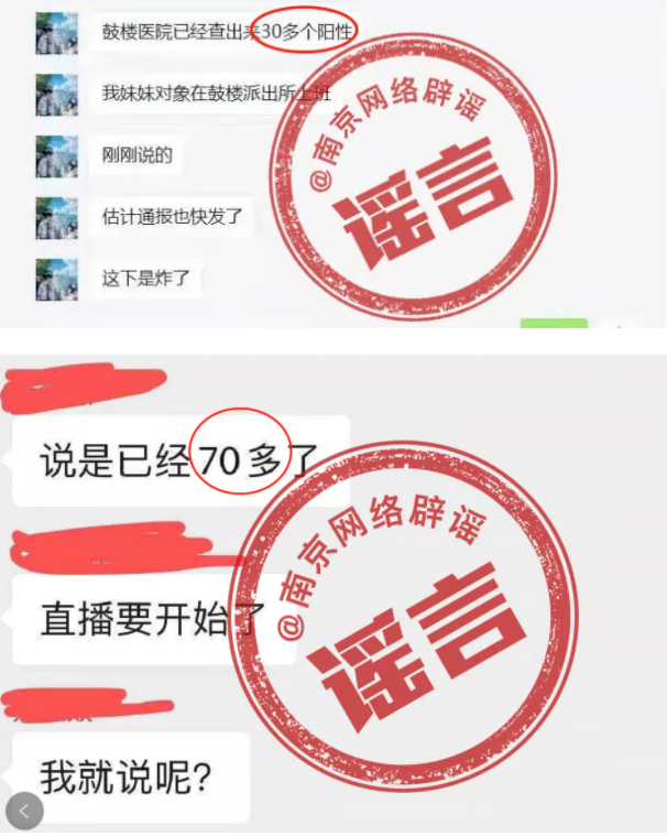 在南京積極應(yīng)對突發(fā)疫情的同時(shí),網(wǎng)絡(luò)卻出現(xiàn)一些不實(shí)信息,稱“南京祿口機(jī)場發(fā)現(xiàn)確認(rèn)病例,其密接者千余人中發(fā)現(xiàn)74例陽性患者”“新數(shù)據(jù)已逼近40人”“鼓樓醫(yī)院查出30多個(gè)陽性”“已經(jīng)70多(陽性)”等,均系謠言!
