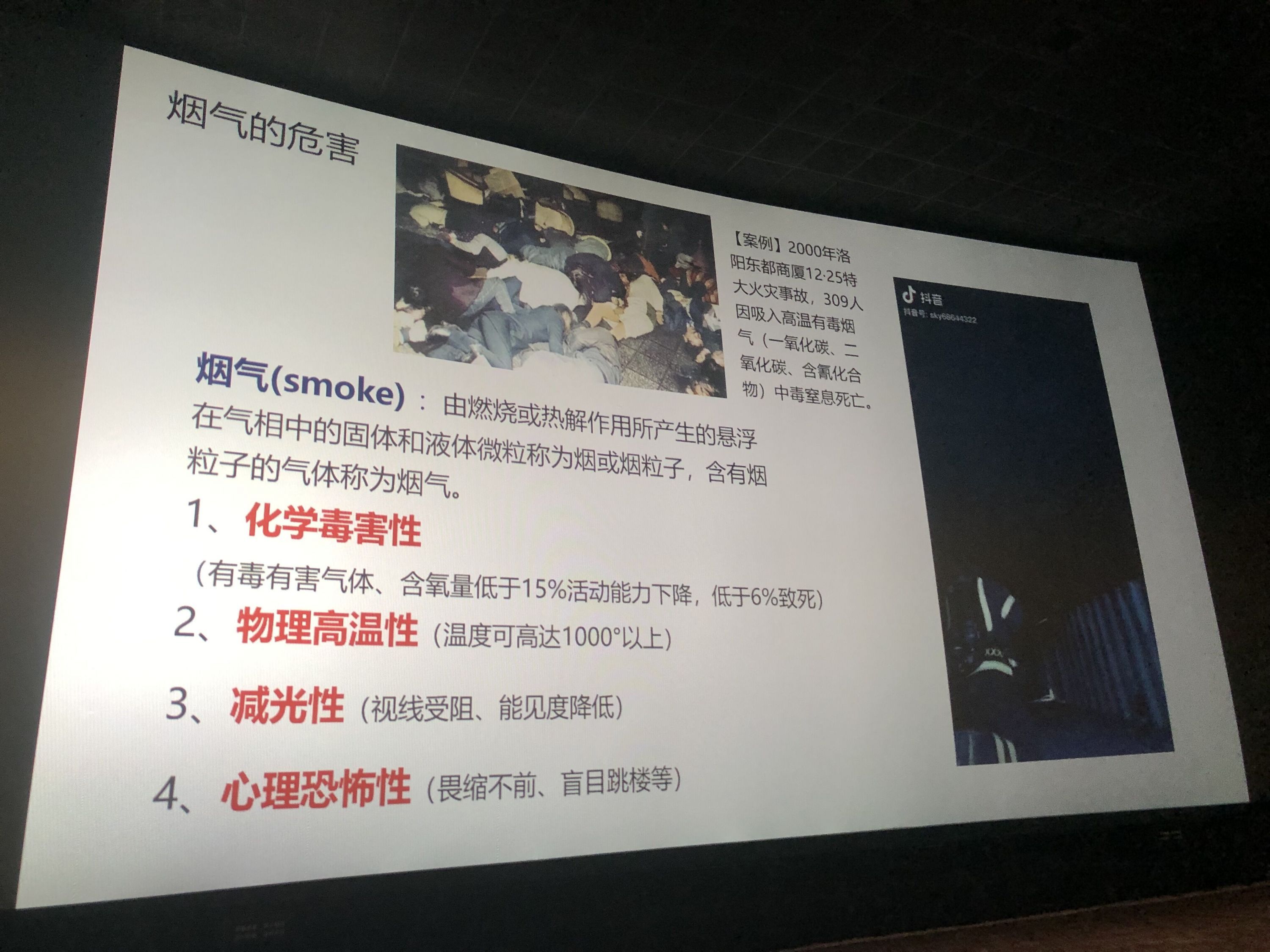 “火災發生后,漂浮的煙氣是可以燃燒的,” 東湖高新區關山消防救援站指導員范子果,在消防培訓中說,“煙氣不僅能燃燒,還高溫有毒,大家在疏散時身子盡量貼近地面匍匐前進,用濕毛巾捂住口鼻,用浸濕的棉被披在身上逃生。”為了讓大家對煙氣的毒害有更直觀的認識,范指導員現場播放了一段煙氣燃燒的視頻。
