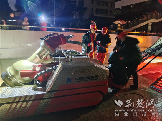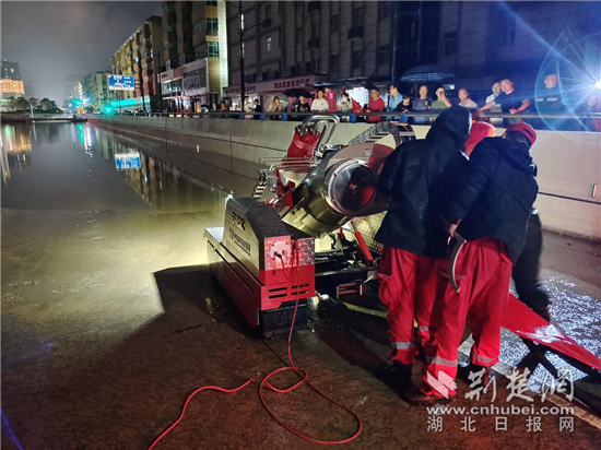 湖北專業(yè)救援力量徹夜抽排鄭州站西廣場附近道路積水。通訊員供圖