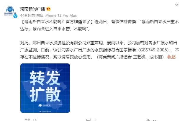 真相: 7月21日,河南新聞廣播官方微博發(fā)布消息稱,對此,鄭州自來水投資控股有限公司鄭重聲明,暴雨以來,公司加密對各水廠原水和出廠水監(jiān)測。目前,該公司各水廠出廠水的水質(zhì)指標符合國家標準(GB5749-2006),不存在不達標情況,所以請居民放心使用。