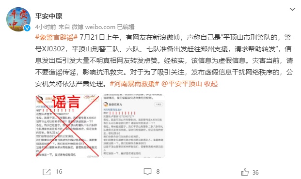 7月21日上午,有網(wǎng)友在新浪微博,聲稱自己是”平頂山市刑警隊的,警號XJ0302,平頂山刑警二隊、六隊、七隊準備出發(fā)趕往鄭州支援,請求幫助轉發(fā)”,信息發(fā)出后引發(fā)大量不明真相網(wǎng)友轉發(fā)點贊。