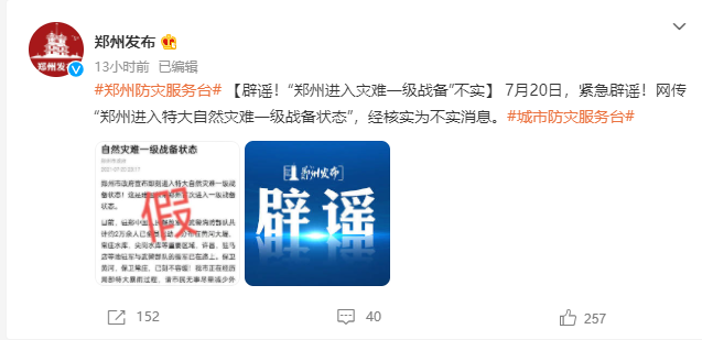 7月20日,“鄭州市政府宣布即刻進(jìn)入特大自然災(zāi)難一級(jí)戰(zhàn)備狀態(tài)”的消息在網(wǎng)上流傳。