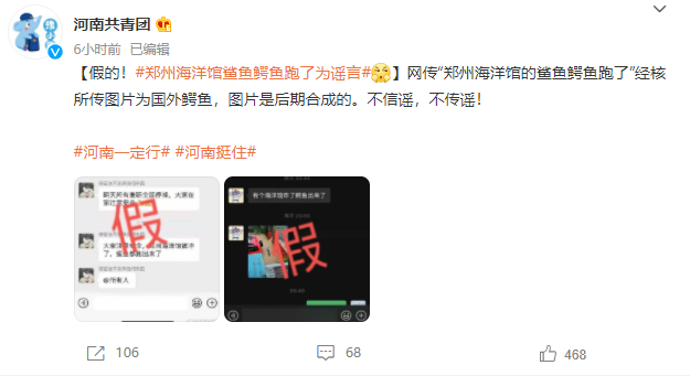 7月20日,社交媒體上流傳一則“鄭州市海洋館被沖了,鯊魚(yú)都跑出來(lái)了”“有個(gè)海洋館炸了鱷魚(yú)出來(lái)了”的消息,還配上了疑似鱷魚(yú)的圖片,引起了不少網(wǎng)民的恐慌。