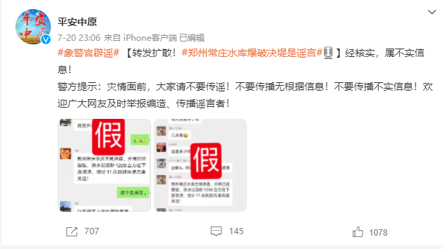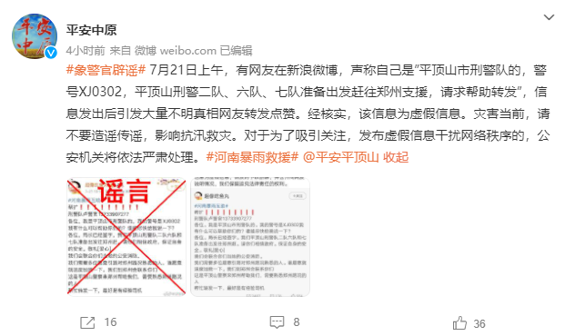 7月21日上午,有網(wǎng)友在新浪微博,聲稱自己是”平頂山市刑警隊(duì)的,警號(hào)XJ0302,平頂山刑警二隊(duì)、六隊(duì)、七隊(duì)準(zhǔn)備出發(fā)趕往鄭州支援,請(qǐng)求幫助轉(zhuǎn)發(fā)”,信息發(fā)出后引發(fā)大量不明真相網(wǎng)友轉(zhuǎn)發(fā)點(diǎn)贊。