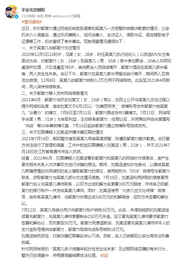 據北京市公安局朝陽分局通報,近日,針對都某竹通過網絡反映受到侵害和吳某凡一方報警稱被敲詐勒索的情況,公安機關介入調查后,通過訊問嫌疑人、詢問當事人、走訪證人、調取書證、固定提取電子證據等工作,初步查明了有關事實。現就調查情況通報如下: