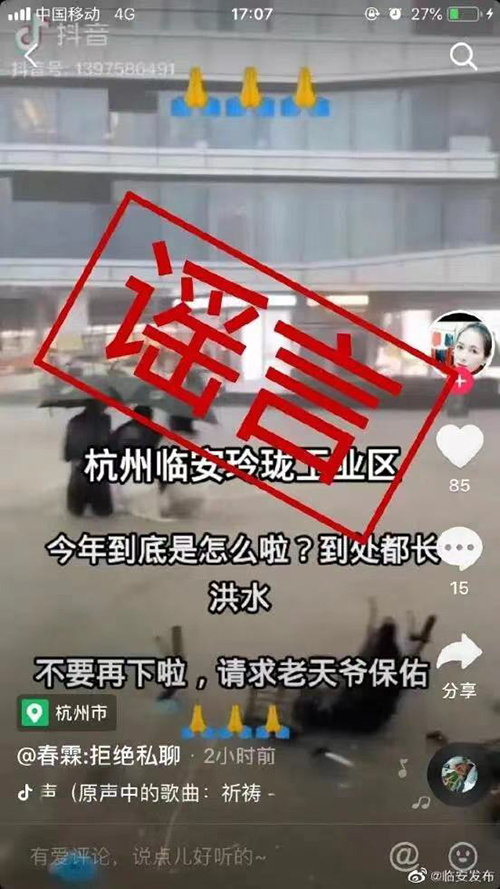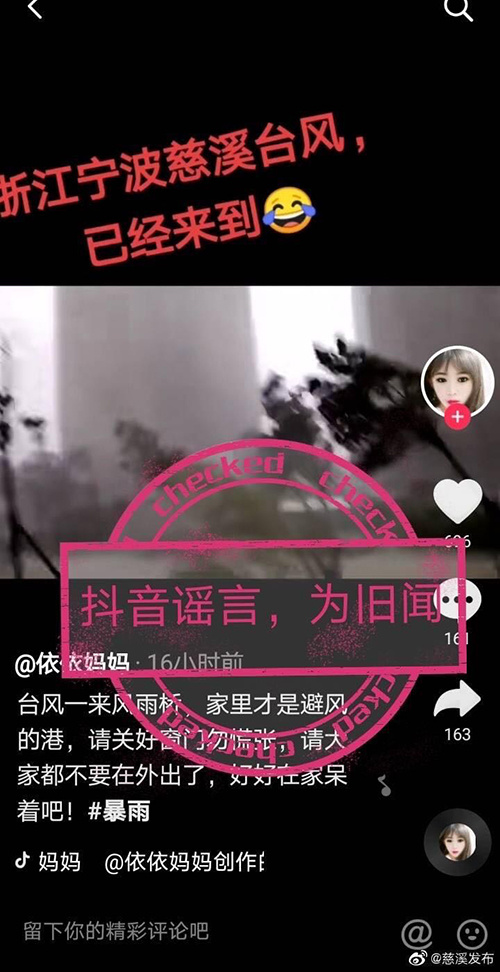 7月24日晚,“慈溪發布”微博消息,抖音中一則聲稱“浙江寧波慈溪臺風已經來到”的謠言,為舊視頻新發,請不要造謠傳謠。