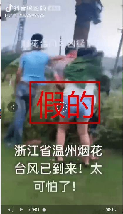 7月24日,一條“浙江溫州煙花臺風已到來!太可怕了!”的短視頻內容在網絡上流傳。這段視頻總共有15秒,視頻中有多人在大風中緊緊抱住大樹,狂風暴雨中大量樹木被吹得東倒西歪,地面一片狼藉。值得注意的是,上傳者在標題中特別強調了“溫州”、“煙花”、“可怕”等字眼。