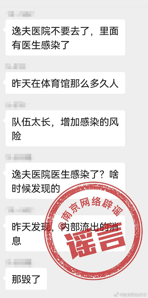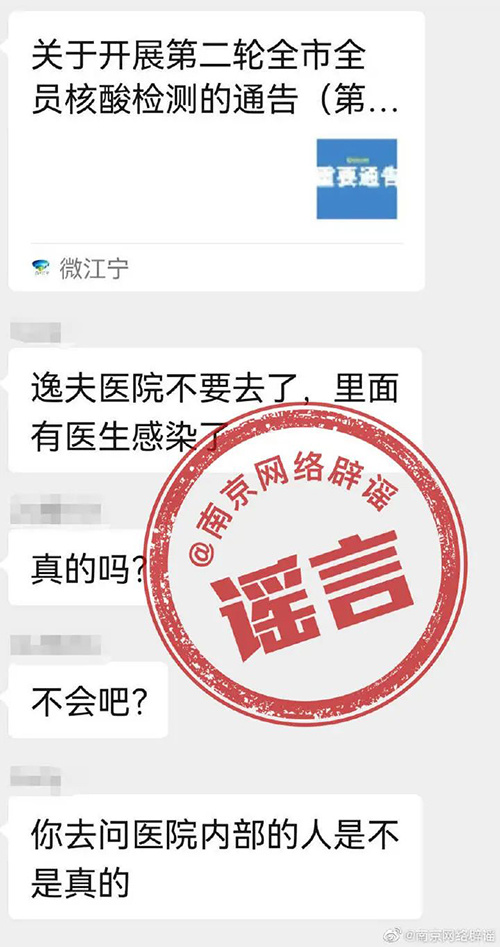 此外,一則“逸夫醫(yī)院有醫(yī)生感染”的信息也在網上流傳,引發(fā)關注。經向南京市衛(wèi)健委核實,目前全市無醫(yī)護人員感染新冠病毒。此消息為謠言!