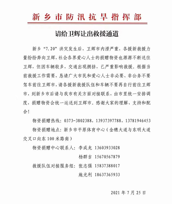 特別提示:衛輝市除搶險裝備外,暫不現場接受社會捐助,捐助請到新鄉市物資捐贈地點市平原體育中心(金穗大道與東明大道交叉口向東100米路南),由市里統一安排調度捐助,捐贈物資會統一運送到衛輝市。已趕到衛輝進行捐助車輛請接受交警統一指揮返回新鄉市進行捐助,避免產生交通擁堵。請相互轉告,感謝大家的理解、支持和配合!
