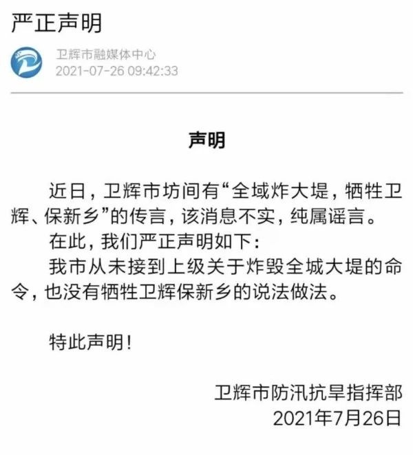 連日來,河南省的暴雨引發關注。7月26日,不斷有“衛輝已經放棄了”的消息在傳播。當日17時許,衛輝市委書記對此回應頂端新聞稱,該消息是假的。“那都是假的,咋可能啊。”