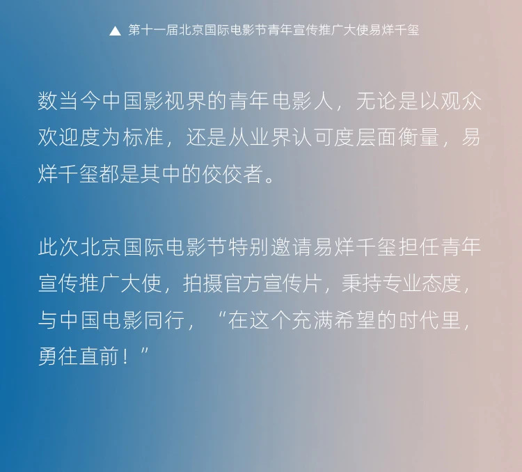 7月27日,第十一屆北京國際電影節發布官方宣傳片,同時宣布易烊千璽擔任本屆電影節青年宣傳推廣大使。
