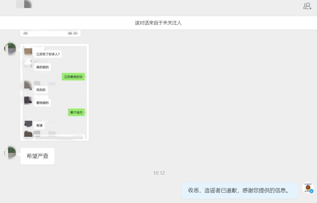 經(jīng)核查,相關(guān)謠言系浙江籍洪某某(男,26歲,現(xiàn)居浙江杭州)通過微信群組“全國***俱樂部”發(fā)出。經(jīng)核查,該洪表示自己根據(jù)2018年某地受災(zāi)視頻炮制相關(guān)不實信息,現(xiàn)已主動發(fā)布澄清道歉信息。目前此案正在進(jìn)一步辦理中。
