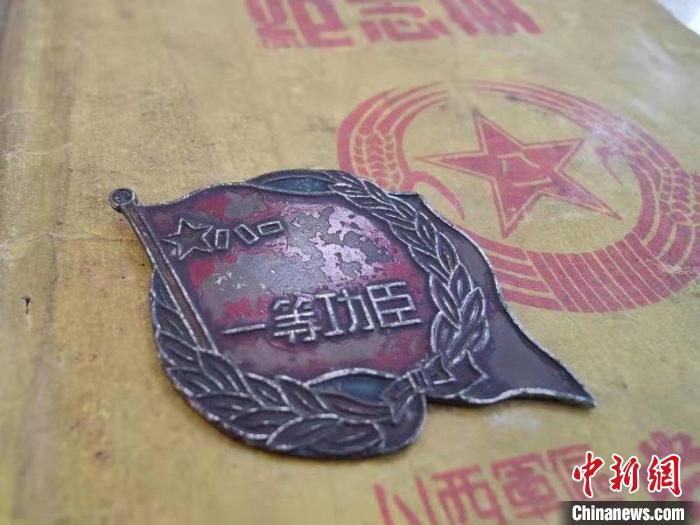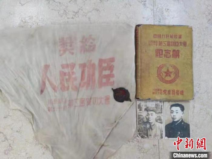 打開(kāi)印著“人民功臣”的泛黃布包,這枚小小的勛章雖已斑駁,但依舊熠熠生輝。此外,這次捐贈(zèng)的物品還有一本紀(jì)念冊(cè)和肖同福年輕時(shí)的兩張照片。