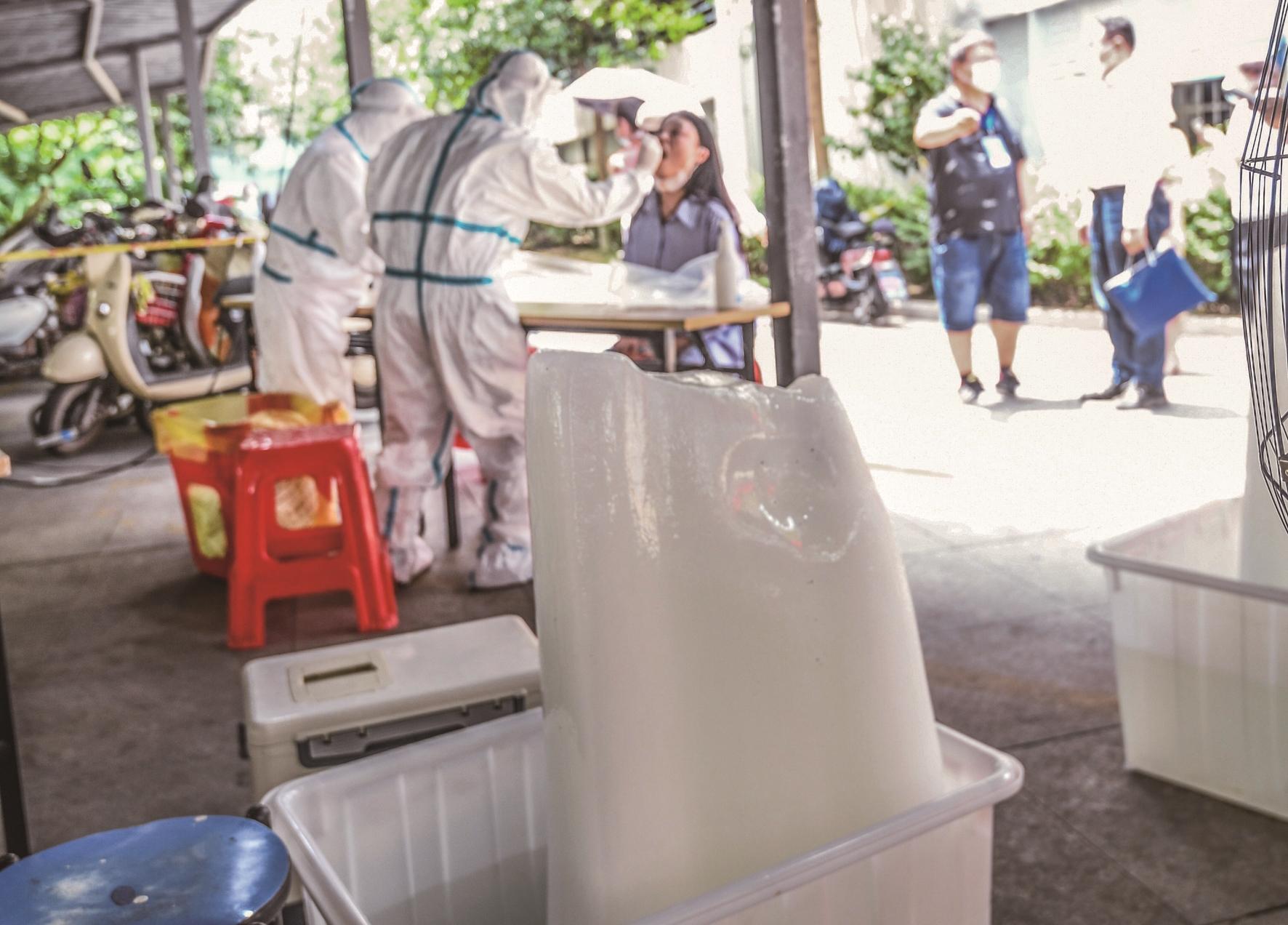 烈日炎炎。5日下午,在北湖街道建設社區,每位醫護人員的腳邊都擺放著一個“巨無霸”冰塊。該社區有3500多位居民,截至中午,僅剩約100位居民還沒做核酸檢測。