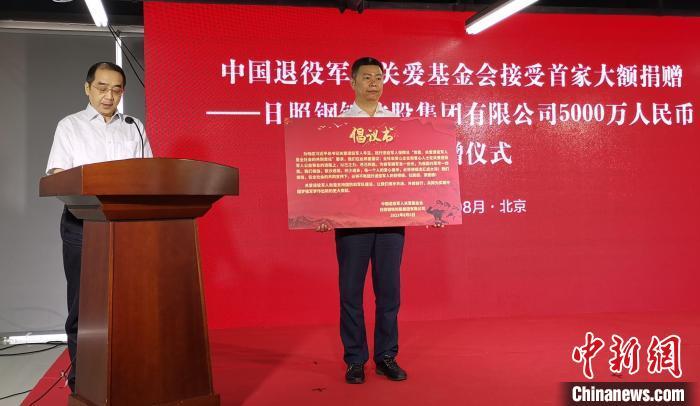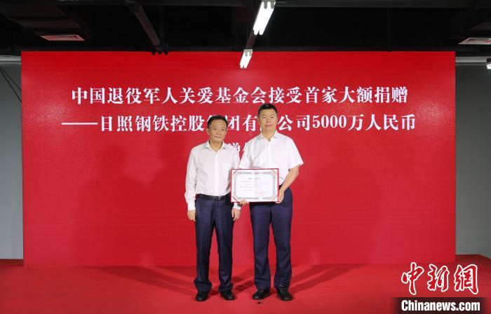中新網北京8月6日電 (記者 李純)退役軍人事務部8月6日上午舉行接受捐贈儀式,日照鋼鐵控股集團有限公司向中國退役軍人關愛基金會捐贈5000萬元人民幣。退役軍人事務部黨組書記、部長孫紹騁出席并向捐贈企業頒發捐贈證書。全國政協常委、經濟委員會副主任、武警部隊原上將政治委員、中國退役軍人關愛基金會名譽理事長孫思敬出席。部黨組成員、副部長馬飛雄主持儀式。