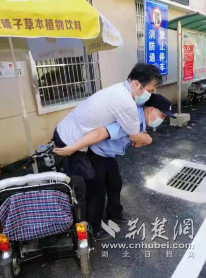 哪里有需要幫助的人,哪里就有警藍的身影。8月4日下午5時許,在江夏區五里界街老年大學核酸采樣點,一位下身截肢的殘疾人坐在輪椅面有難色,輔警見狀主動詢問,發現其無家屬陪伴,隨即彎腰讓殘疾居民趴到自己的背上。他一把背起這位居民步行至20米外的檢測點登記檢測,待其檢測完后再背出來坐上輪椅。