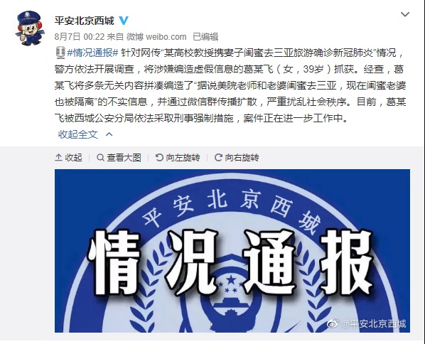 近日,因涉嫌編造“某高校教授攜妻子閨蜜去三亞旅游確診新冠肺炎”的虛假信息,嫌疑人葛某飛被北京西城公安分局依法采取刑事強(qiáng)制措施。
