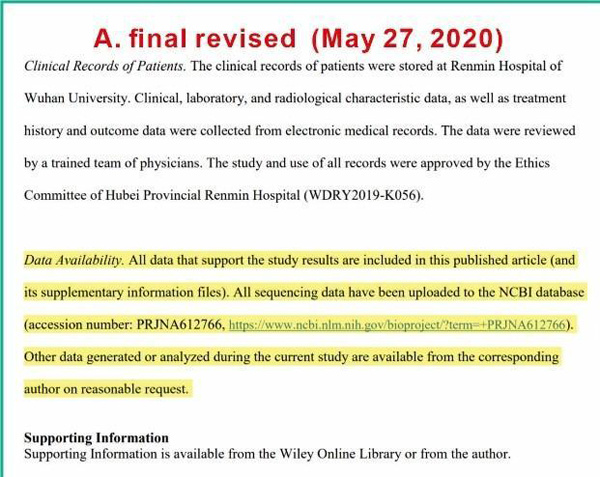 《紐約時報》援引杰西·布盧姆質疑進行的報道。 7月22日,新華社記者專訪了一名武漢大學當事專家,請他還原事件原委。真實情況遠沒有一些西方媒體描繪得那么具有戲劇性,而僅僅是正常學術行為,涉及的新冠病毒數據也和溯源沒有任何關系。這名專家表示,為研發新冠病毒檢測新技術,他所在的科研團隊分別于2020年1月底和2月中旬采集兩批新冠患者樣本進行分析。該團隊后將研究成果投稿至一家西方學術期刊。為滿足投稿要求,該團隊將實驗相關數據上傳至美國國立衛生研究院管理的NCBI數據庫,并在論文草稿中專門撰寫了一段內容,詳細注明了在數據庫里如何訪問和獲取其數據。但編輯部在審稿過程中,誤將該段指向數據的文字整體刪除,中方科研團隊也因此在2020年6月申請將有關數據撤回。
