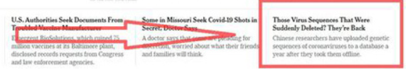 7月30日《紐約時報》首頁相關文章位置。真相雖然可能遲到,但不會缺席。隨著新華社報道獲得廣泛傳播,這個針對中國的新冠溯源陰謀論被成功擊破,打擊抹黑者的氣焰。事件始作俑者是一個名為杰西·布盧姆的美國科研人員。在他的推波助瀾之下,有人又惡意發揮“想象力”:是不是中國心里有鬼?是不是中國政府指使刪除早期新冠病毒數據,以達到阻礙新冠溯源工作的目的?
