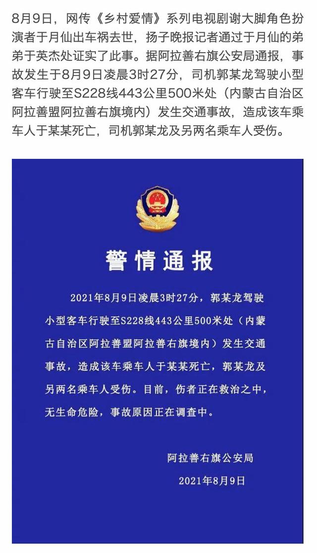 中國青年報客戶端8月9日北京電(中青報中青網記者吳曉東 李桂杰)電視劇《鄉村愛情》中“謝大腳”扮演者于月仙,8月9日上午在內蒙古阿拉善拍片,發生車禍,最終因傷勢太重宣告不治。于月仙的丈夫張松林授權中青報中青網刊發《訃告》: