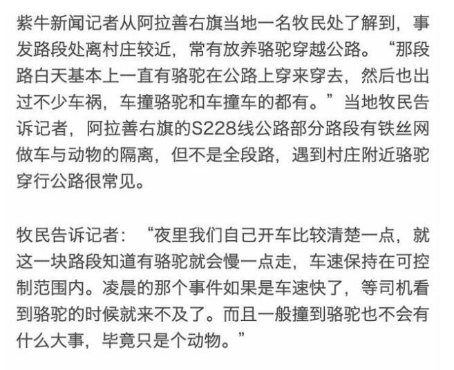 【#目擊者稱于月仙車禍現場駱駝內臟遍地#】8月9日,著名演員于月仙去世。據媒體報道,#于月仙乘坐車輛撞上駱駝致車禍#。揚子晚報/紫牛新聞記者聯系上一名經過事發現場附近的目擊者。該目擊者稱,事故現場有一輛棕色路虎車,現場周邊已被封鎖,無法靠近,但能看到駱駝被撞得四處亂飛的內臟。同時,記者從阿拉善右旗當地一名牧民處了解到,事發路段處離村莊較近,常有放養駱駝穿越公路。“那段路白天基本上一直有駱駝在公路上穿來穿去,然后也出過不少車禍,車撞駱駝和車撞車的都有。”當地牧民告訴記者,阿拉善右旗的S228線公路部分路段有鐵絲網做車與動物的隔離,但不是全段路,遇到村莊附近駱駝穿行公路很常見。(揚子晚報/紫牛新聞見習記者 陳燃)