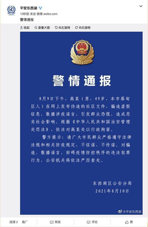 8月9日下午,高某(男,49歲,本市蔡甸區人)在網上發布偽造的社區文件,編造虛假信息,散播涉疫謠言,引發群眾恐慌,造成惡劣社會影響。8月10日,根據《中華人民共和國治安管理處罰法》,武漢東西湖警方依法對高某處以行政拘留。