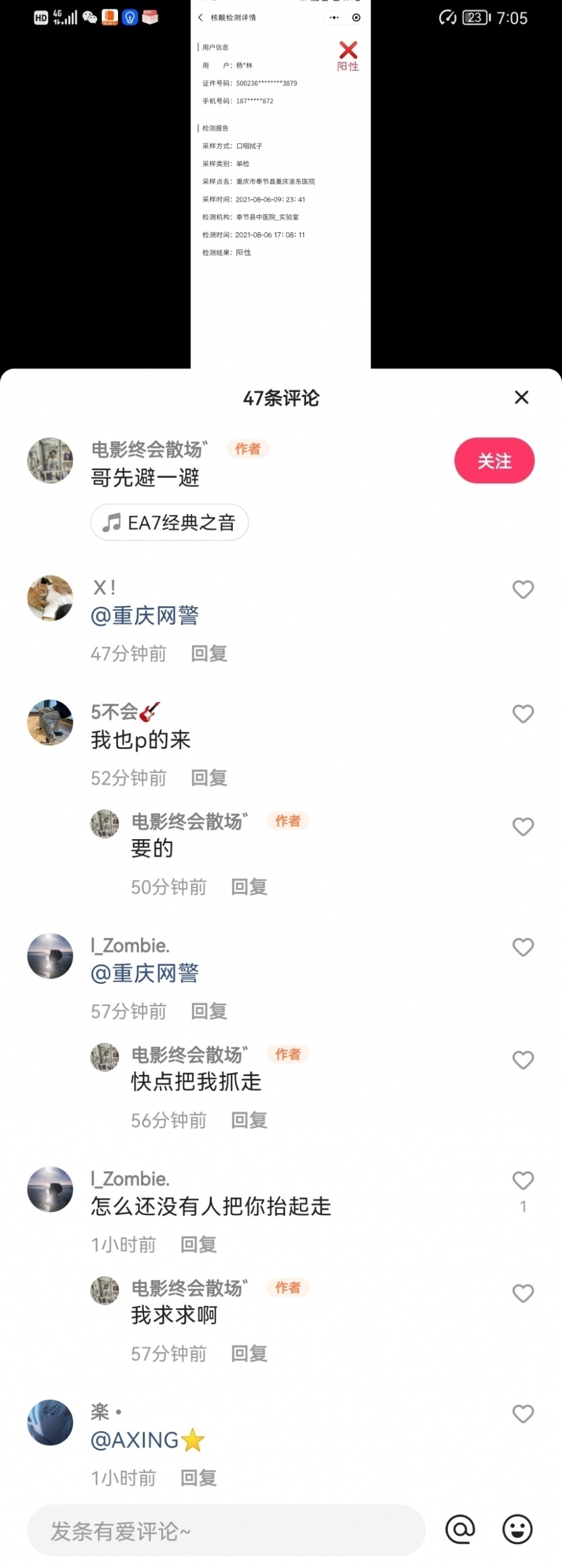 “核酸檢測是陽性,快點把我抓走,我求求啊……”2021年8月8日,重慶奉節警方通過網上巡查發現,某短視頻平臺用戶“電影終會散場”散布涉疫情謠言。