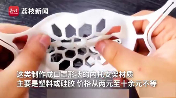這種“防悶神器”在設(shè)計上如何做到緩解口罩的悶熱感?為探究竟,有消費者從網(wǎng)絡(luò)平臺上購買到這種“口罩防悶神器”,發(fā)現(xiàn)其內(nèi)有一個口罩形狀的支架托,將它固定在口罩內(nèi)側(cè),戴上后,口罩便不全貼合在臉上。