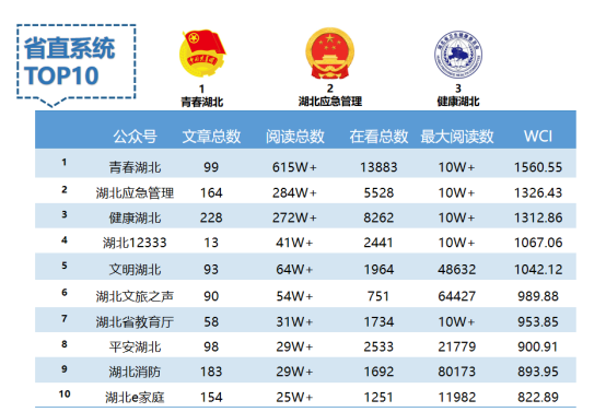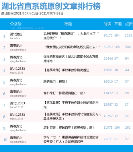 8月12日,由荊楚網(湖北日報網)、楚天輿情數據研究院制作的湖北省直微信排行榜7月榜單發布,“青春湖北”“湖北應急管理”“健康湖北”位列三甲,“湖北消防”今年首次沖入前十。