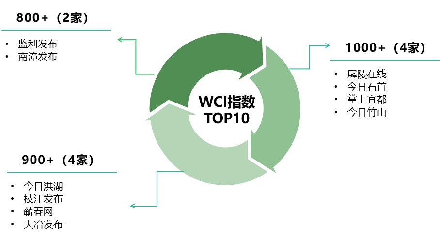 從WCI指數(shù)來看,本期上榜單位WCI值整體較6月得分上升,1000以上的有4個,900-1000區(qū)間的也有4個。“今日石首”WCI增量下降,主要是因為閱讀總數(shù)增量、平均閱讀數(shù)增量均有減少,且其頭條文章閱讀增量為10799次,遠不及“孱陵在線”的79063次,另外,其在看總數(shù)、最大閱讀數(shù)均不及第一名,盡管在看總數(shù)增量超過“孱陵在線”,但遺憾未能保持冠軍地位。“枝江發(fā)布”WCI增量最高,主要是因為平均閱讀數(shù)、頭條文章閱讀增量均為最高,文章總增量排名第二,其在看總數(shù)增量、最大點贊數(shù)均表現(xiàn)不俗。