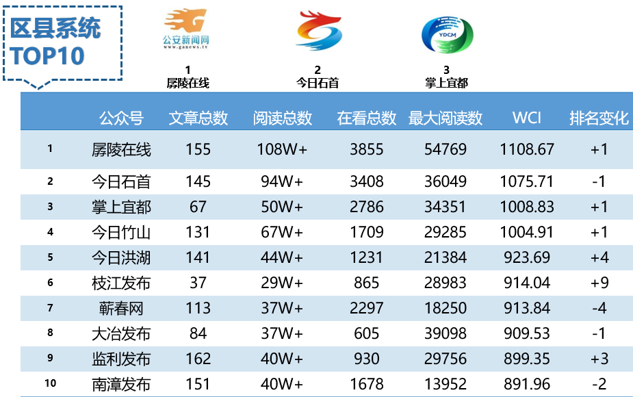 從閱讀總數(shù)來看,整體表現(xiàn)較6月有小幅增長,“孱陵在線”閱讀總量較上月增加4W+,“今日竹山”閱讀總數(shù)增量為150998排第一,遠超“孱陵在線”的109442;“掌上宜都”的平均閱讀數(shù)、在看總數(shù),在看總數(shù)增量、最大在看數(shù)均排入前三,表現(xiàn)優(yōu)異;“今日洪湖”平均閱讀數(shù)增量緊跟“孱陵在線”位居第四,“枝江發(fā)布”以閱讀總數(shù)增量排第三,再次打入榜單。