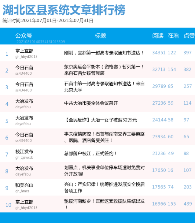 從原創(chuàng)文章排行榜來看,“掌上宜都”的《剛剛,宜都第一封高考錄取通知書送達!》排第一。“今日石首”攜3篇原創(chuàng)文章強勢入圍,其中兩篇排第二、第三,分別是《東京奧運會平衡木(資格賽)暫列第一!來自石首女孩管晨辰》《石首市第一封高考錄取通知書送達!來自北京大學》。“大冶發(fā)布”同樣攜3篇原創(chuàng)文章入圍,其中兩篇分別排第四、第五,分別為《中共大冶市委全體會議召開》《【全民反詐】大冶一女子被騙32萬元》。