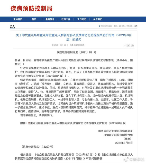 國家衛健委發布《重點場所重點單位重點人群新冠肺炎疫情常態化防控相關防護指南(2021年8月版)》,明確重點場所重點單位重點人群增加至85類。
