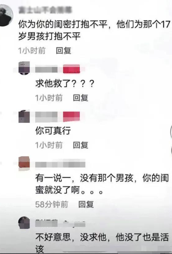 有大量疑似被救女孩的賬號,在網上稱:“我們又沒有求他救,這個事情我們也道歉了,還要怎么樣?”“他自己逞能,我們也感謝他父母了。難道我們三個人的命比不上他自己的一條命嗎?”“別罵了,你們越罵我,我心里就越沒有愧疚感”。