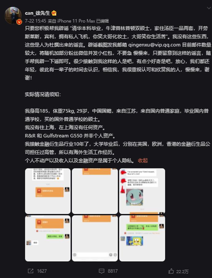 “我接觸金融衍生品行業10年了,大學畢業后,分別在英國,歐洲,香港的金融衍生品公司擔任過高管,所以有海外生活工作經歷?!毙烨诟硎?,網傳的個人信息系謠言,希望網友可以幫助自己辟謠。