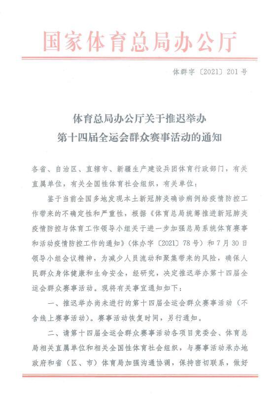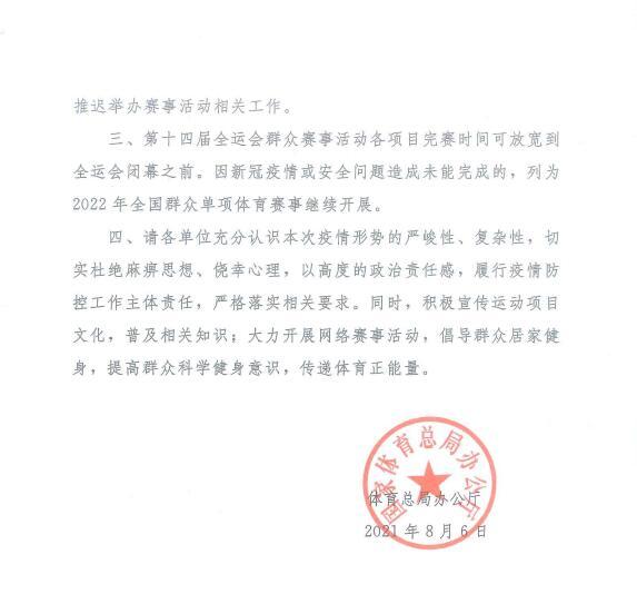 通知指出,鑒于當前全國多地發現本土新冠肺炎確診病例給疫情防控工作帶來的不確定性和嚴重性,為減少人員流動和聚集帶來的風險,確保人民群眾身體健康和生命安全,決定推遲舉辦第十四屆全運會群眾賽事活動。