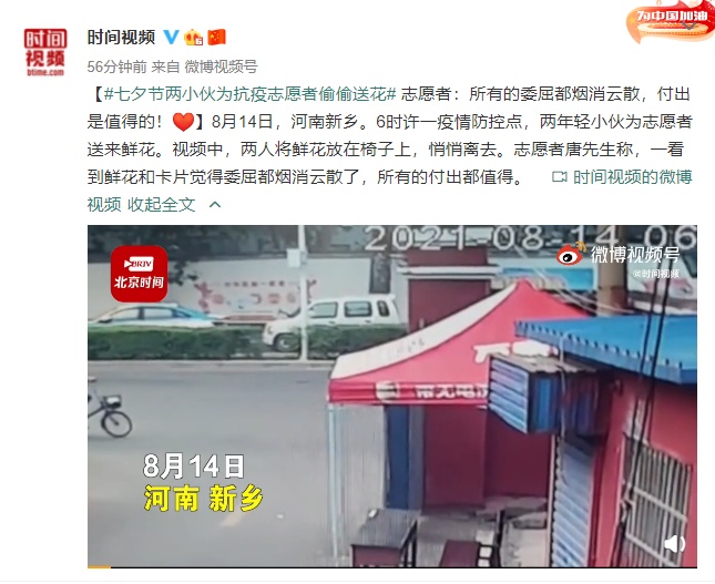 【七夕節(jié)兩小伙為抗疫志愿者偷偷送花 志愿者:所有的委屈都煙消云散,付出是值得的!】8月14日,河南新鄉(xiāng)。6時許,一疫情防控點,兩年輕小伙為志愿者送來鮮花。視頻中,兩人將鮮花放在椅子上,悄悄離去。志愿者唐先生稱,一看到鮮花和卡片覺得委屈都煙消云散了,所有的付出都值得。
