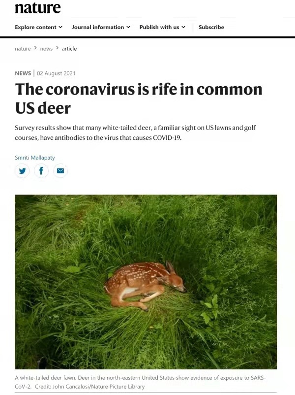 據英國《自然》雜志網站報道,美國農業部研究人員對美國東北部部分白尾鹿的血清樣本進行新冠病毒抗體分析研究發現,三分之一被抽樣的白尾鹿體內有新冠病毒相關抗體,這表明它們曾感染新冠病毒。