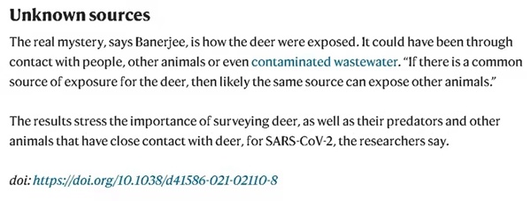 研究人員對保存更早的部分樣本進行檢測后發現,在2020年年初收集的樣本中,有3個樣本檢測出相關抗體;在2019年收集的樣本中,有1個樣本檢測出相關抗體。這讓研究人員感到困惑:白尾鹿究竟是怎么感染新冠病毒的?