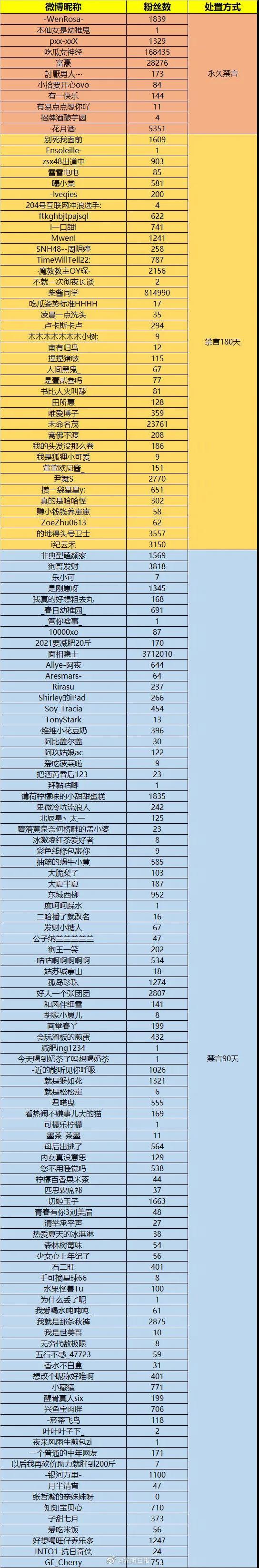 圍繞2021“清朗·‘飯圈’亂象整治”系列專項(xiàng)行動的相關(guān)要求,以及《微博社區(qū)公約》的相關(guān)規(guī)定,微博平臺對以上違規(guī)行為進(jìn)行了重點(diǎn)清查,對相關(guān)惡意營銷號和黑粉賬號等進(jìn)行了從重處罰,具體處置情況如下: