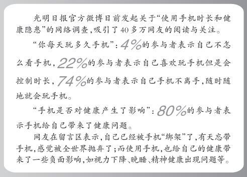記者在采訪中了解到,很多人在與家人、朋友聚會時,多數時候都是各自在玩手機,溝通減少,范長河告訴記者,當太多的時間花在手機上,過度沉浸在手機世界里,也會造成一定程度上的社交障礙,帶來人際關系的緊張。