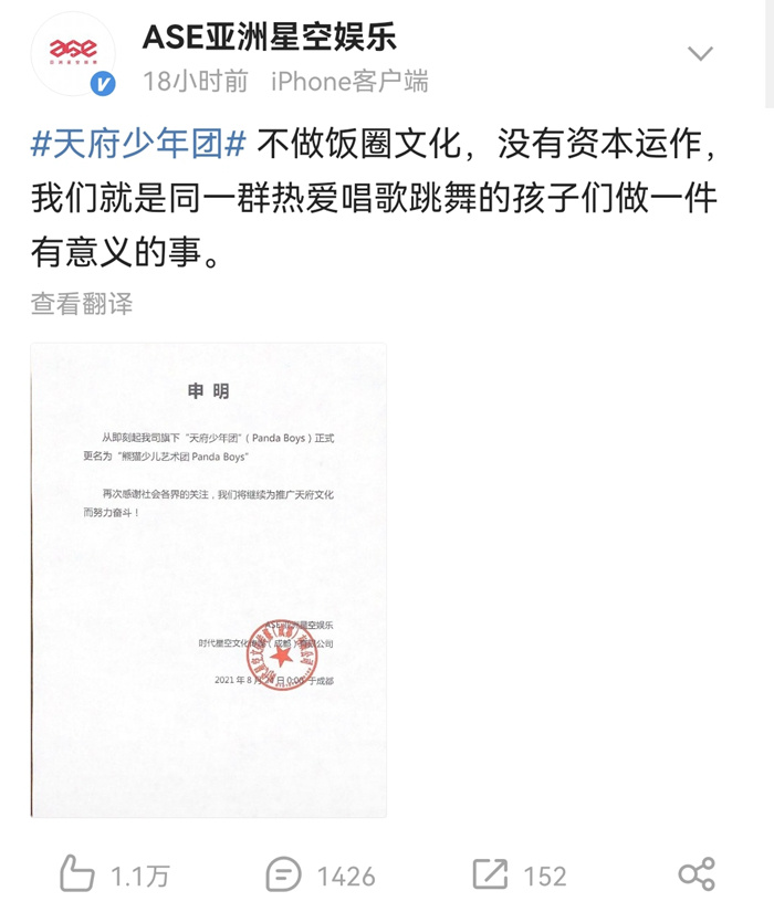 24日凌晨,公司再次回應,不做飯圈文化,沒有資本運作,并將“天府少年團”(Panda Boys)更名為“熊貓少兒藝術團 Panda Boys”。