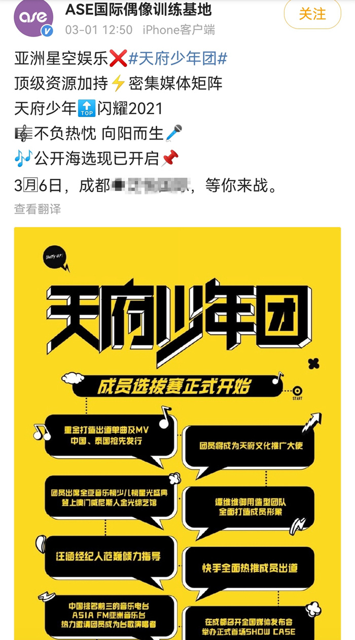翻閱這家經紀公司的微博,一篇《ASE偶像產業2021牛勁十足》的文章曾寫道:ASE國際偶像訓練基地中國首站落戶成都,以首個出道偶像團體“天府少年團”拉開ASE在中國的偶像產業序幕……