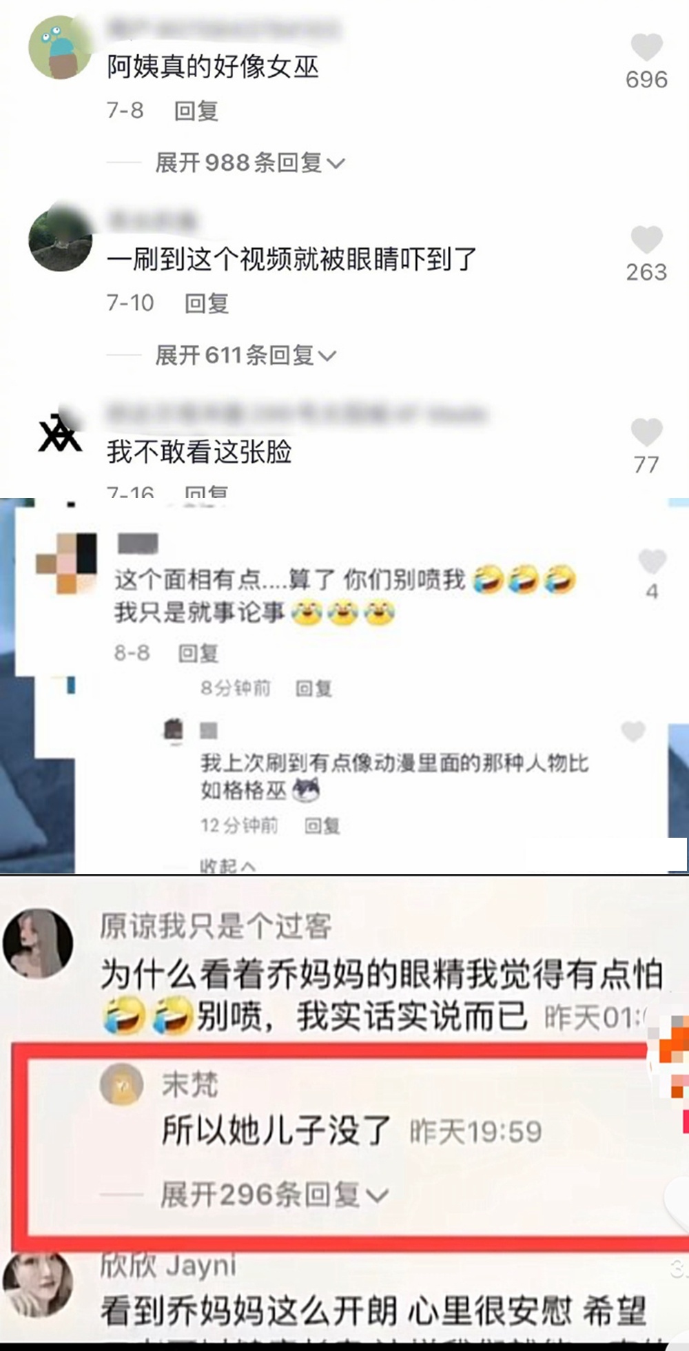 然而,在該賬號的評論區,卻出現很多惡意評論。有人攻擊喬任梁父母的長相,“嘴歪眼凸”。也有人認為他們不該那么快樂。還有人稱,他們拍視頻是消費兒子,“吃兒子的人血饅頭”等等。