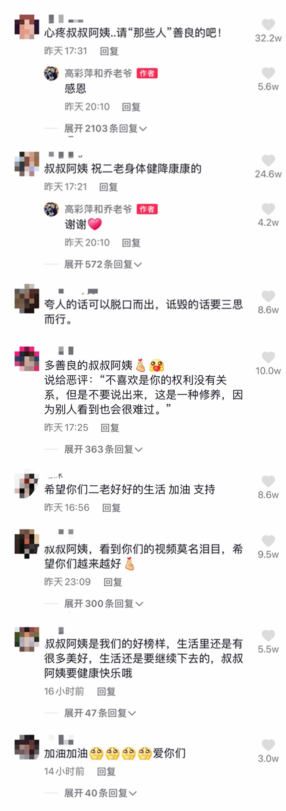 有人說,希望你們越來越好。有人祝愿兩位老人身體健康。還有網友回懟“惡評”,夸人的話可以脫口而出,詆毀的話要三思而行。“不喜歡是你的權利沒有關系,但是不要說出來,這是一種修養,因為別人看到也會很難過。”